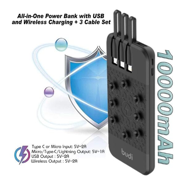 Budi - 10000mAh Wireless Power bank with 3 integrated cables and 2 cable inputs Accessories - Suction cups to attach to the device - Phone Stand - Charging Charger Micro Mobile Portable Usb Smartphone
